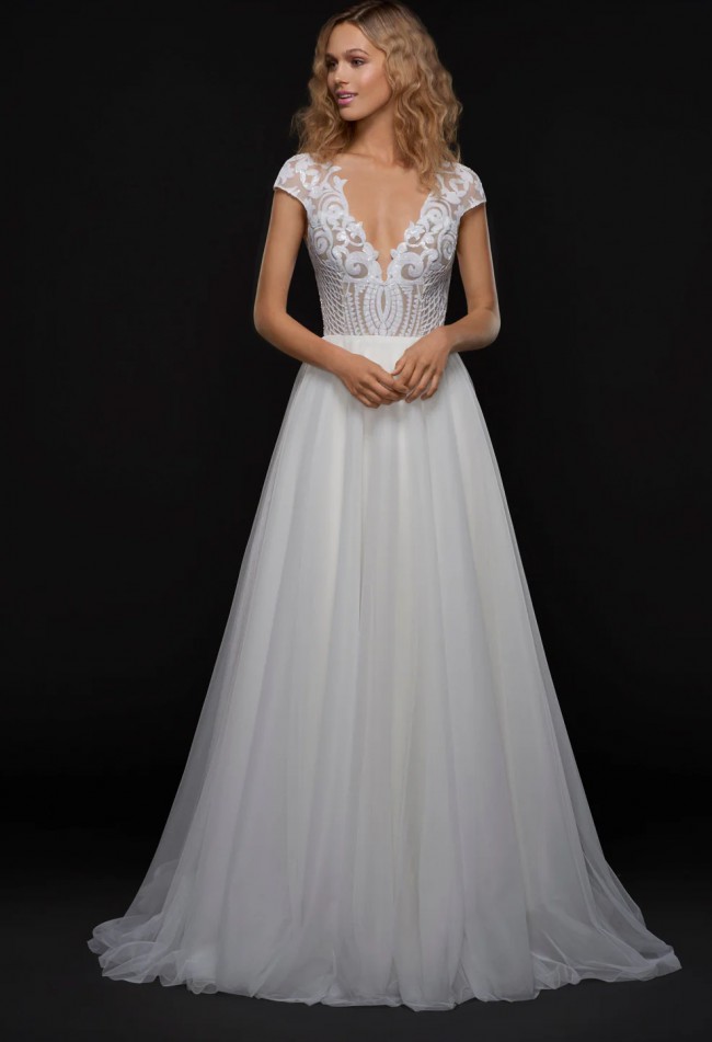 This Dakota 1753 dress by Hayley Paige is a stunning choice for the modern bride seeking elegance and charm on her special day. The exquisite A-line silhouette gently flows from a flattering V-neck bodice, creating an enchanting silhouette that beautifully enhances your figure. Its delicately capped sleeves add a touch of sophistication while ensuring comfort as you celebrate with loved ones.