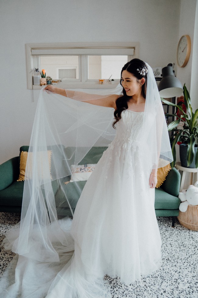 This A-line wedding dress has only been worn once, then dry cleaned professionally and stored away since. I purchased it brand new from Brides of Beecroft in March 2023. I am also looking to sell the veil which I purchased brand new from Brides of Beecroft as well. This has been factored into the price but happy to sell the dress and veil separately.