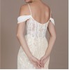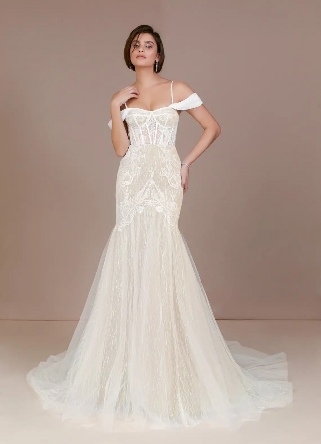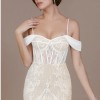 Azazie lexington champagne mermaid Dress. Beautiful sequin details with soft tulle underneath. A cathedral train and corset front. Beautiful button details and off sholder removable sleeves.