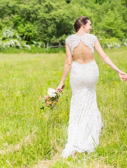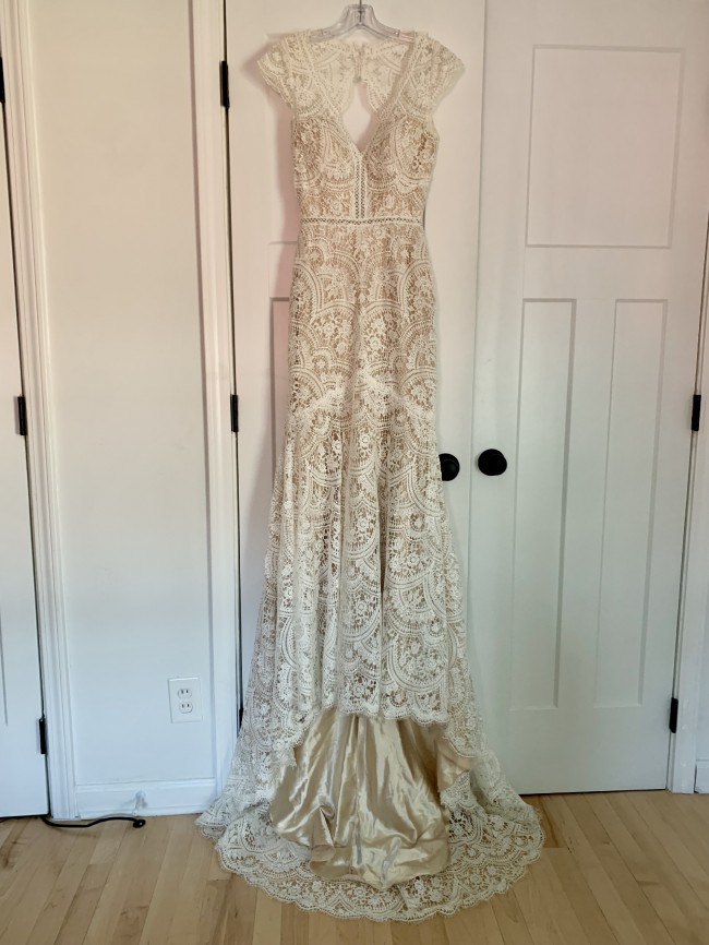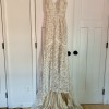 This stunning Wtoo trumpeted wedding dress was the centerpiece of my special day and now I hope to pass it on to another bride who will feel just as beautiful. The delicate ivory lace offers a romantic touch, adorned with intricate embroidery and pearls, creating an enchanting effect. The V-neckline elegantly highlights the collarbone, while the capped sleeves provide just the right amount of coverage, making it feel both timeless and modern. It has an added bustle for dancing without tripping after the photos and ceremony is over.