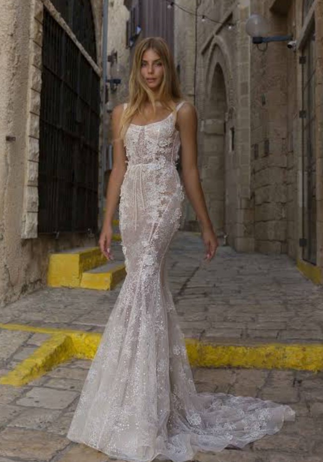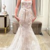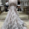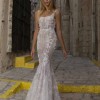 Berta Privee Style 21-P110 is part of the no.5 collection. This dress has a softly structured bodice. It has a square neckline and the sparkle lace fabric is adorned with flowers The dress has a low scooped back and a long train with a ribbon tie at the waist.