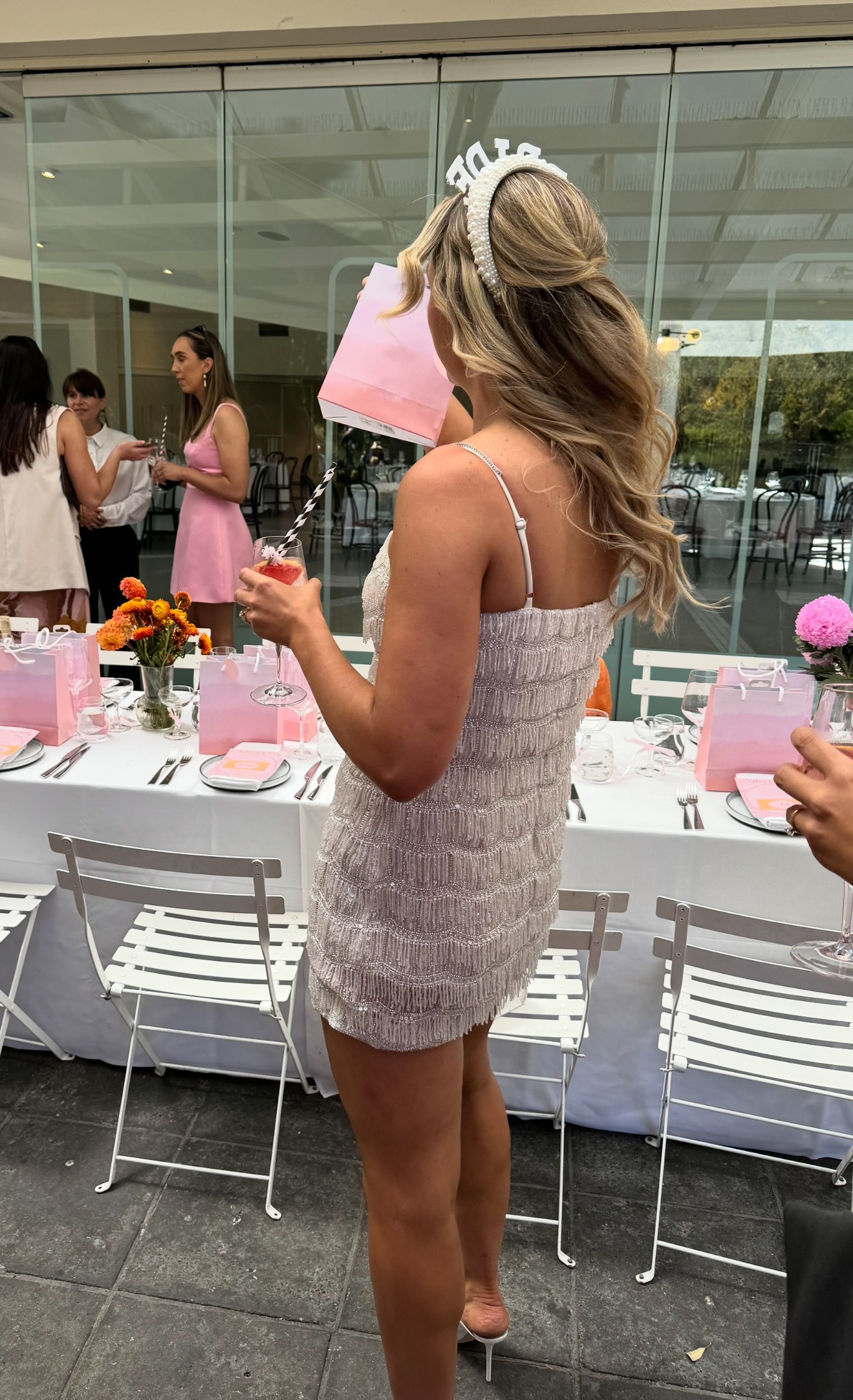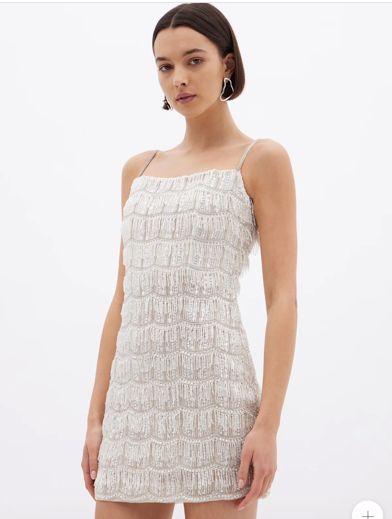 The Sadie Mini embodies structural design whilst embracing feminine form. This square neck style features internal boning to create shape and provide support through the bodice, and is adorned with hand placed beaded fringes throughout.