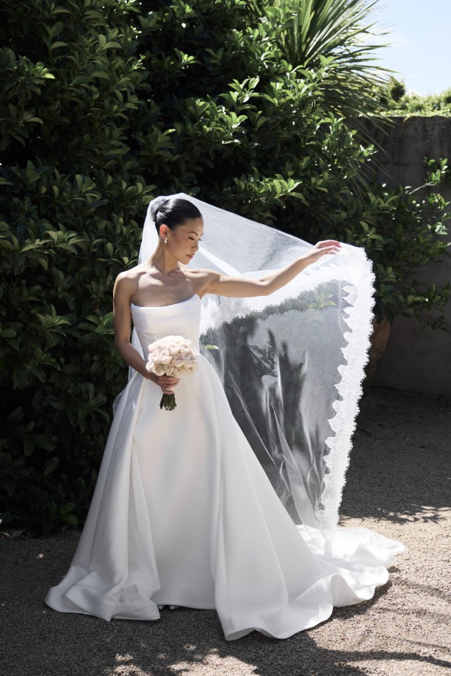 Cut from luxe duchess satin and featuring a delicate bust panel drape over a structured corset and dipped front waist.