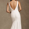 A plunging back and sheer mesh panels lend a sultry vibe to this sleek crepe sheath. With a high-neckline and a figure-flattering fit, it’s minimalism at its best. By Watters Bride.