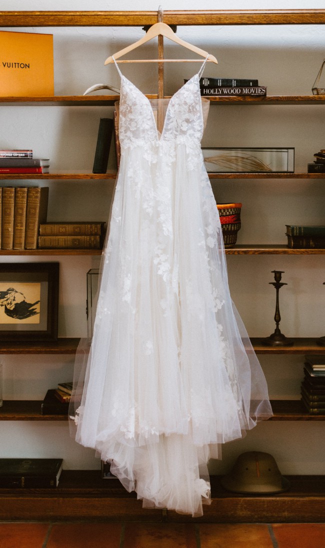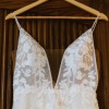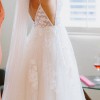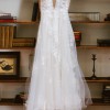 Beautiful A-Line gown with delicate floral appliqué details and beading. The chapel length train with option for an American bustle makes this dress a wonderful option for both ceremony and reception. It is easy to walk and dance in. It has been professionally cleaned.
