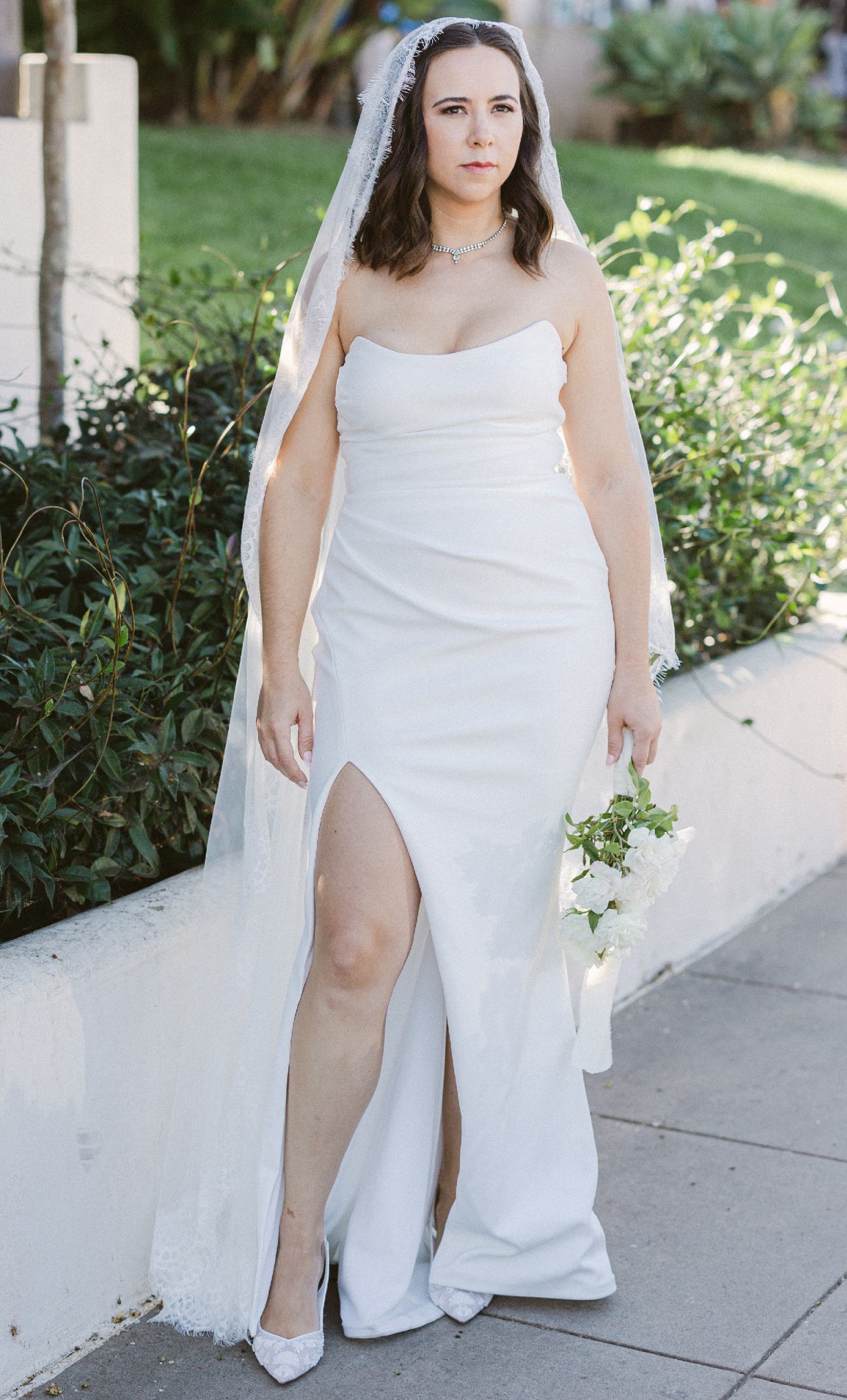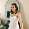 This dress was tailored and fits my measurements like a glove. I wore the low back Skims shapewear with it and felt amazing in this dress! If you prefer a looser fit, make sure your measurements are a bit smaller than mine. The bottom hem has some wear because it drags on the floor just an inch or so. The back has a unique design element that makes it feel almost backless but still gives the support needed for a fitted dress. The color name is ivory but in person it is white white, not ivory.