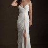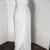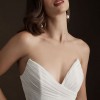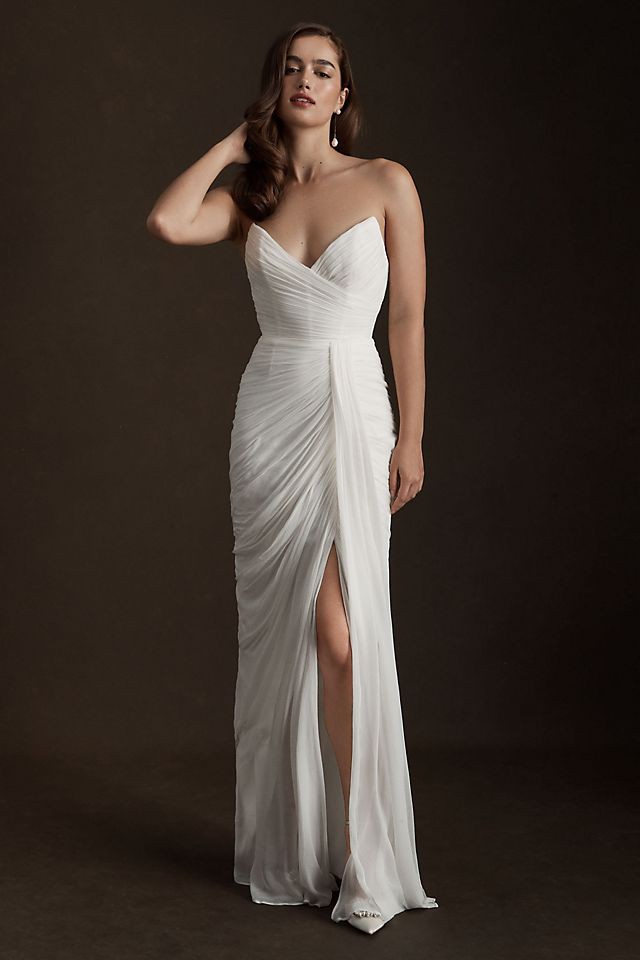 An enchanting sheath silhouette with a deep sweetheart neckline and textured folds, the idyllic Watters Lupine Wedding Gown blossoms with gentle draping, radiating a refreshing and feminine essence. A textured, ruched fabrication draws the eye to the striking strapless bodice, down to the fitted faux wrap waist, finishing with a striking front slit moment.
