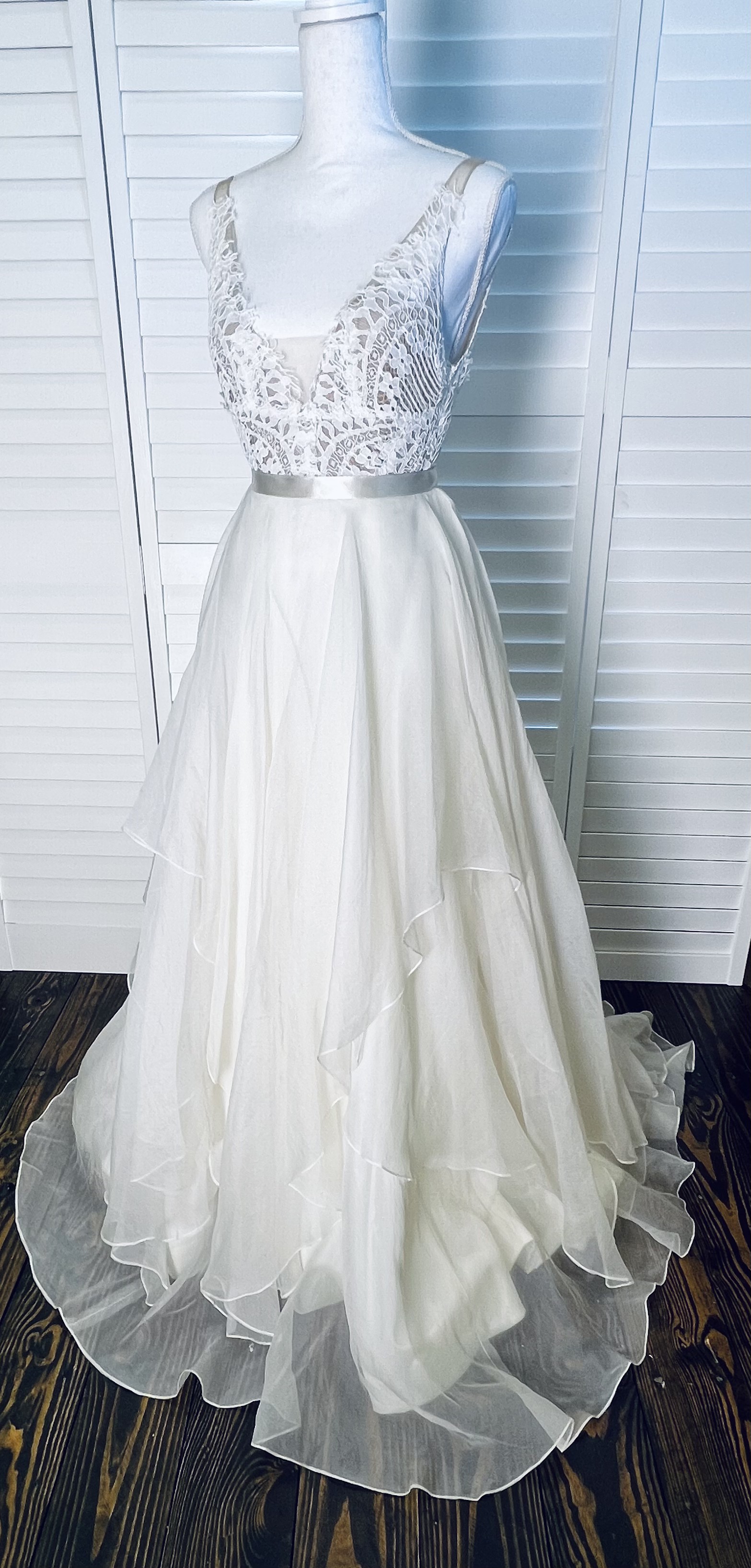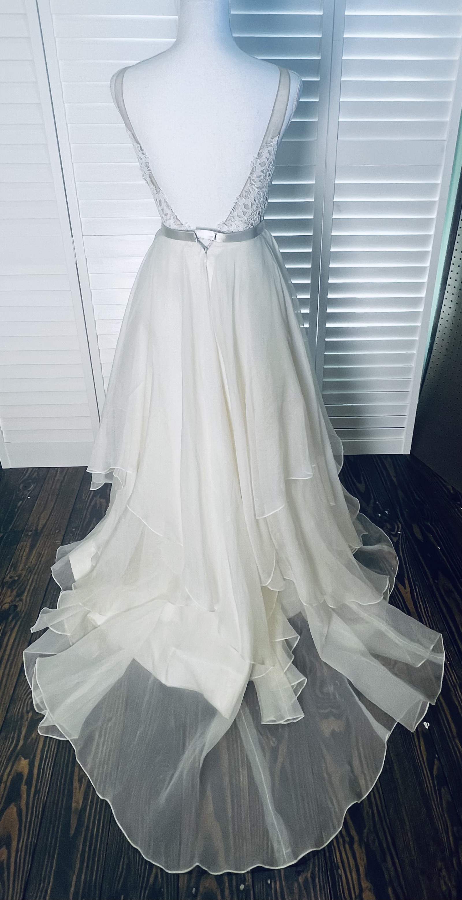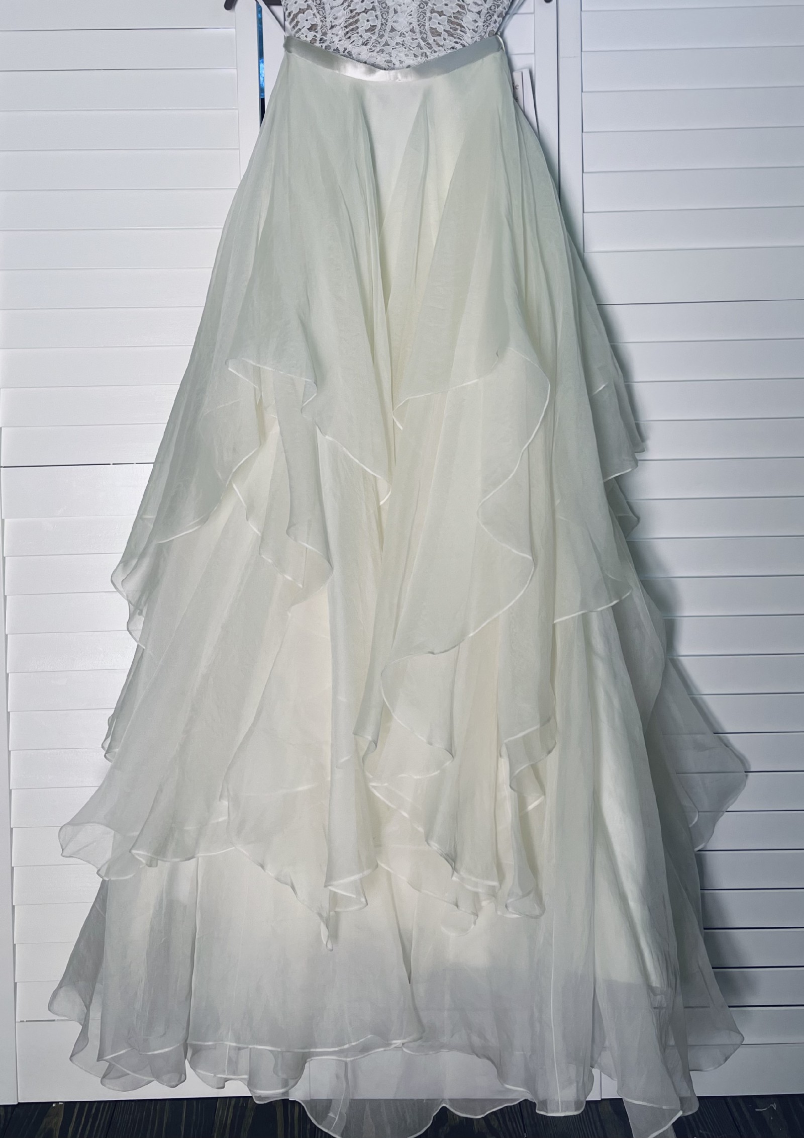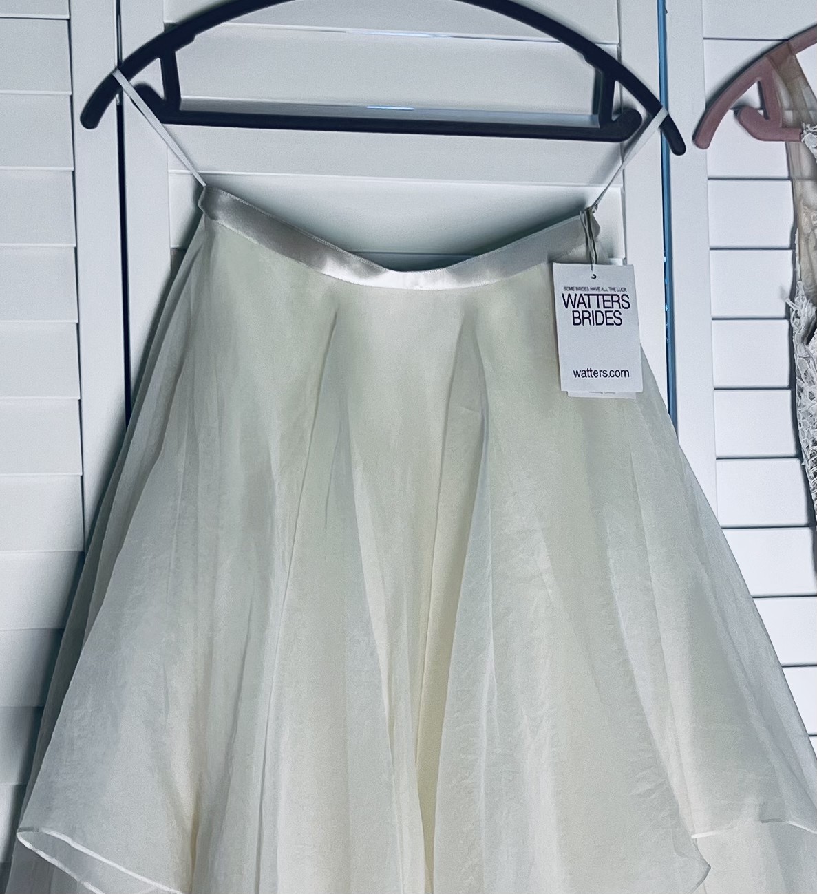 Wtoo for Watters Odelia bridal bodysuit (shown in images 3 & 4) not included, but can added to purchase of skirt for an additional $225. Bodysuit is a label size 2, fits between a size 0 and 2. Brand new with tags, retails for $595.