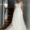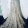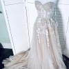 A classic sweetheart and A-line silhouette paired with the striking modern sequin floral motif cascading over the structured bodice and down the tulle skirt. A slit adds a touch of drama to this enchantingly romantic look. Finished with a full train, shining floral details, and a low open back.