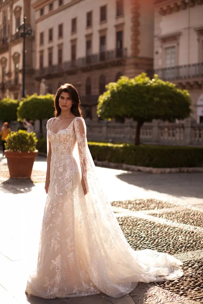 Stunning sample Eva Lendel dress, with cape included. Nude and Ivory colour **this dress has had no alterations as it remains unused - I have not measured the length of dress but it is standard length** There is a tear of material near the zip that needs to be repaired - see video. I was aware of this when purchasing as it should be easily repairable Open to offers and would be happy to answer any questions Please go by the label size and measurements! Remember that wedding dress sizes come up smaller than standard UK sizing so don’t use your usual sizing. Thank you 💕