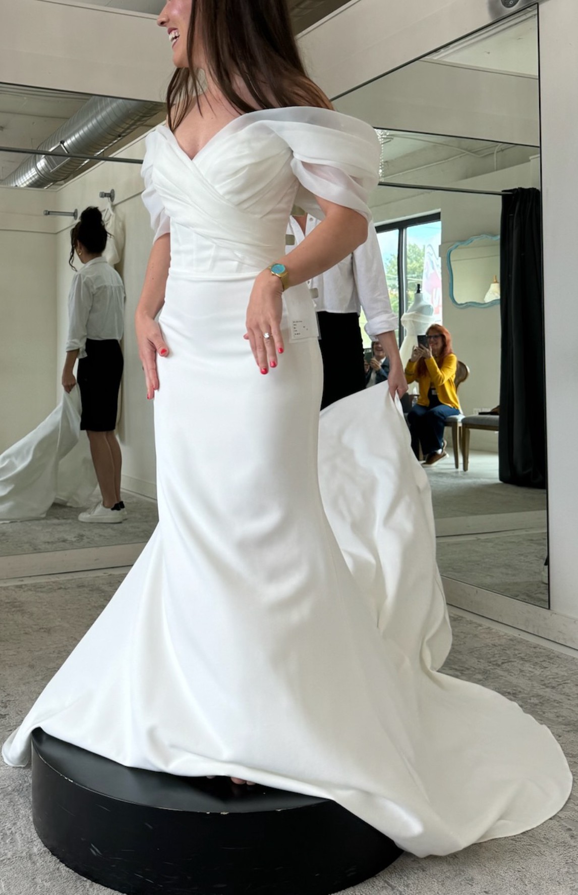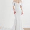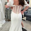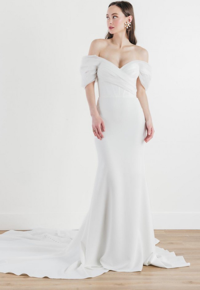 This Amita gown by Wtoo is brand new, unaltered, and never worn! It features an off the shoulder neckline crafted from Satin Organza, and a fit-and-flare silhouette made from Cyrus Stretch Crepe and charmeuse. It is finished with a corset constructed bodice and Illusion Tulle low back, and has a gorgeous dramatic train with buttons. It is very comfortable to wear and the lining is wonderfully silky feeling.