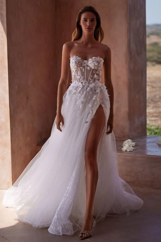 Euphoria by Milla Nova | Gorgeous semi-sheer tulle wedding dress. Features a semi-sheer sweetheart bodice with built-in cups, embellished with floral lace, lace back closure and tulle puffy skirt. Has high slit.