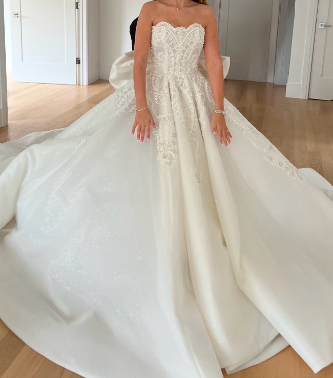 This is a Leah Da Gloria Ophelia gown. Worn once and dry cleaned. Custom detachable bow was added. It was taken in a little bit in the chest area. This fits like a size 4. Was bought in NYC. This gown is still being sold and it’s current price is $15,750.