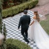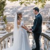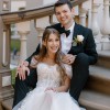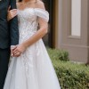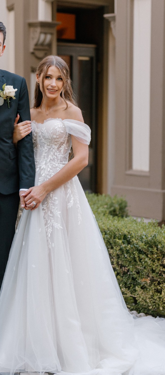 This stunning wedding dress in an elevated designer boho style is a perfect fusion of romance and elegance. The strapless sweetheart bodice is crafted from translucent fabric that delicately showcases the intricate corset construction beneath, with a row of fabric-covered buttons at the back for a touch of vintage charm. Detachable, custom-made off-the-shoulder sleeves add volume and movement, creating an ethereal effect that can be removed for a different look. The waist is cinched with precision, leading into a soft, flowing A-line skirt made from layers of airy tulle. Adorned with intricate leafy lace details, the skirt cascades gently to the floor, while a high front side slit offers a modern touch of allure and graceful movement. The gown is finished in ivory lace, tulle, and royal organza over a rum-colored base, creating a beautiful contrast and an unforgettable silhouette. The long train adds drama and sophistication, making it a perfect choice for a boho-chic bride seeking timeless beauty with a modern twist.