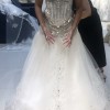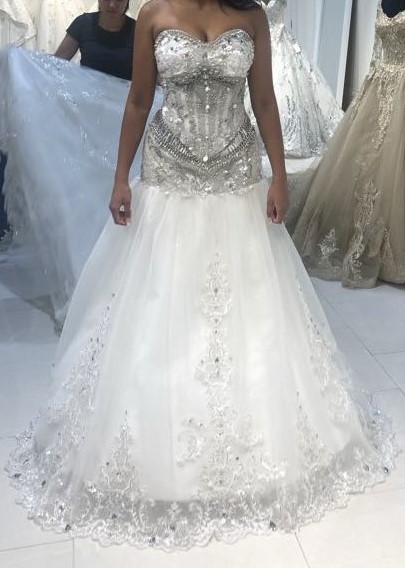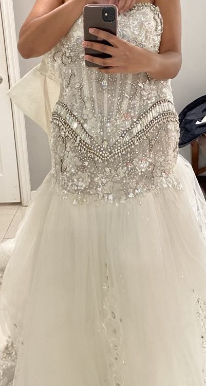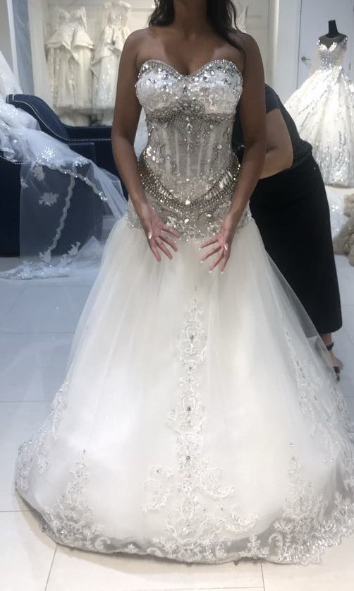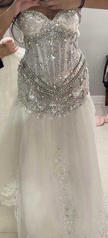 New dress, never worn as I purchased a custom dress later on. This type of stonework is so hard to find - I looked everywhere. Corset back completely snatched my waist and the stones glittered and make the hips pop. Comes with super sparkly veil. Hoping it goes to a bride seeking a glam and sexy vibe! (it was a little too sexy for my family haha). The bust in some pictures looks smaller because I had it altered later to cover more of my bosom. Included so you can see the stonework. Happy shopping!