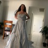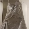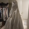 Sivery white with bluish tones ballgown ornate wedding dress with jeweled rhinestones,pearls, Bedding, and Lace. Train and built in petticoat. Triple layered veil...unique one of a kind dress Also drawstring back really allows for sites 2 to 10 so keep in family and pass on to daughters and granddaughters!