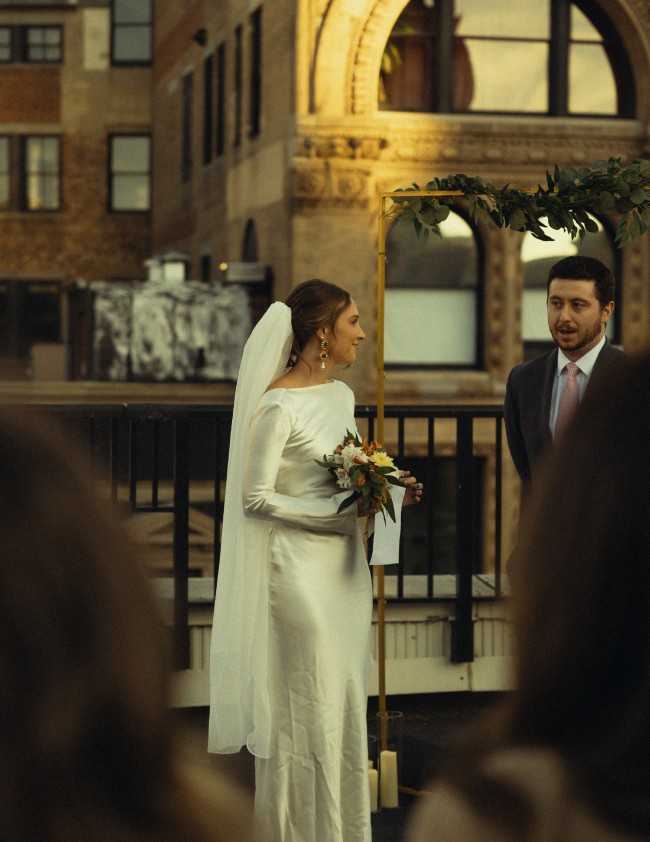Stunning and elegant wedding dress. Simple enough to allow for statement earrings, but unique enough to turn heads. I really wanted a silk or satin dress that maybe wasn't as distracting as some of the bigger options, and that allowed by own beauty to shine too. This dress is silk wool, so has the simple and elegant look of silk but the durability of wool. The train was out for the ceremony only and then kept up in the bustle for the rest of the night. Marks from the floor on the train were all expertly removed through a multi-step professional dry cleaning process. Features on this dress that did not come in the factory-made item but I really appreciated by way of my tailor: