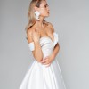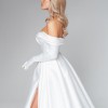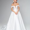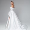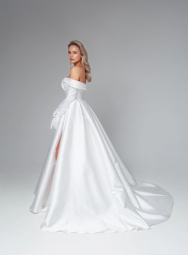 This stunning off-the-shoulder bridal gown exudes timeless elegance and sophistication. Crafted from luxurious satin, it features a fitted bodice with a plunging neckline and delicate draped straps that enhance the neckline. The full A-line skirt gracefully flows into a sweeping train, creating a regal and romantic silhouette perfect for your special day.