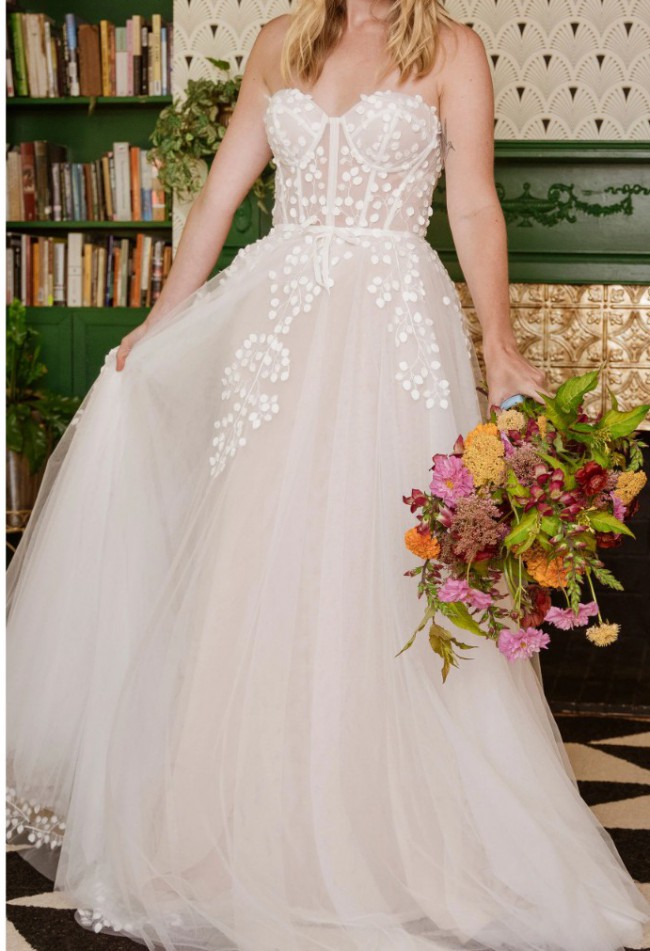 Hello! I am selling this beautiful wedding dress, I have decided to go with another dress. This dress has never been worn, or tried on, it arrived in the box, inside of a garment bag and I took it out long enough to take pictures of it.