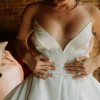 - The underskirt crinoline is permanent attached and we added a significant bustle system to be able to preserve the ability to have the underskirt while bustled as a ball gown bustle with multiple (6 -8 total) interior buttons under the skirt itself