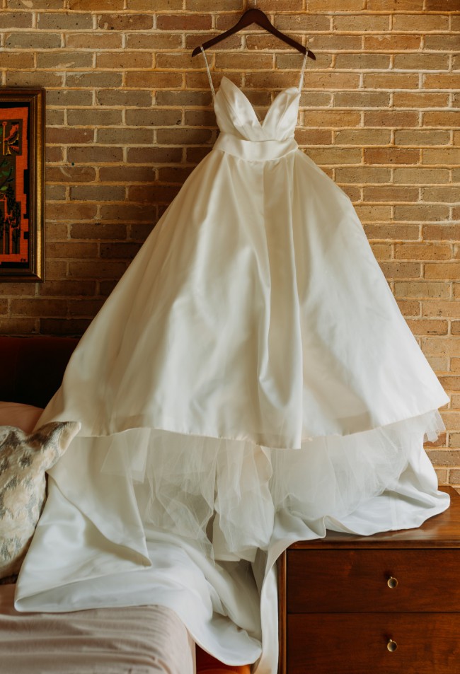 This exquisite Ines Di Santo Quice gown is the epitome of elegance and romance, and it shaped the most magical day of my life. This strapless ballgown features a beautifully curved neckline that enhances your natural beauty while providing a timeless silhouette. Made from luxurious ivory satin, the fabric is VERY LIGHT (even for a Texas summer wedding) and the gown flows effortlessly to the floor over layers of crinoline which gives it it's ball gown shape.