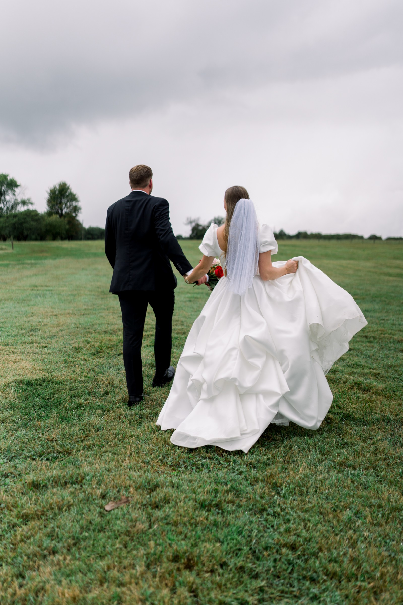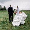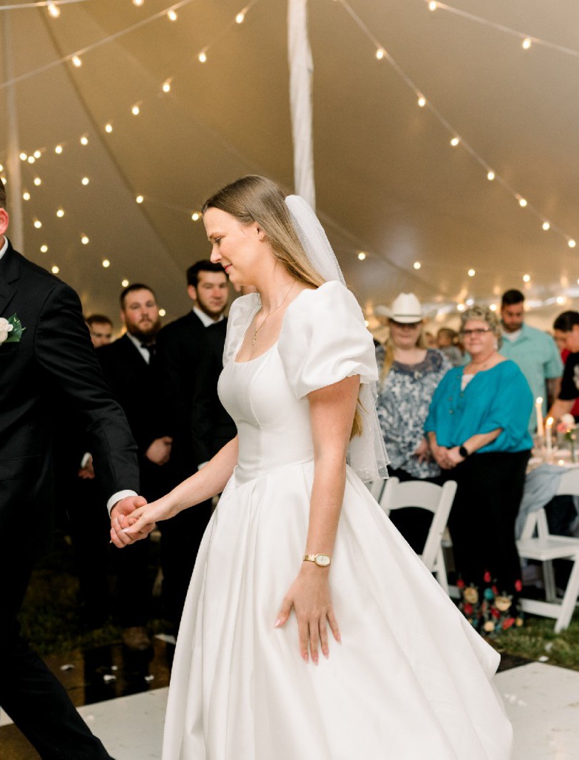 - 3 point bustle for train, dress can be worn down for dramatic flair during ceremony/photos and then bustled for cascading beauty and practical comfort for reception and dancing