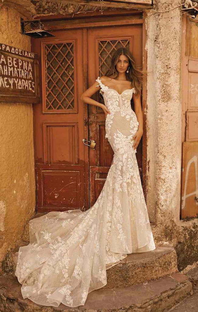 Berta: New, Unworn, & Unaltered! I purchased this stunning dress and never wore or altered it. The best part is that it can be altered for the first time according to your own measurements. This dress showcases Berta’s premium-level finishes beautifully. A plunging sweetheart neckline and low back are elegantly accentuated by draped off-the-shoulder straps with 3-dimensional floral lace detailing. The nude corset bodice is incredibly flattering for all figures, drawing attention to the breathtaking train covered in floral appliqués. Delicate beading on the lace adds the perfect touch of sparkle to the stunning floral design. Dress Details: • Silhouette: Fit and Flare • Neckline: Sweetheart • Waistline: Dropped Waist • Sleeve Style: Spaghetti Straps • Back Style: Low Back • Dress Length: Floor Length • Train: Cathedral • Fabric: Lace • Features: Lace appliqué, Corset bodice, Embroidery More About the Berta 19-101 Gown: This gown is from Berta’s Athens Fall/Winter 2019 collection, celebrated for its exquisite craftsmanship and modern design. It features a semi-sheer corset bodice with molded bra cups, delicate beading on Venice lace, and bold floral appliqués on the train. The straps can be worn on or off the shoulder for versatile styling. A Berta size 40 corresponds to approximately a U.S. size 4-6, with standard measurements: • Bust: 36.2 inches • Waist: 27.5 inches • Hips: 37.7 inches