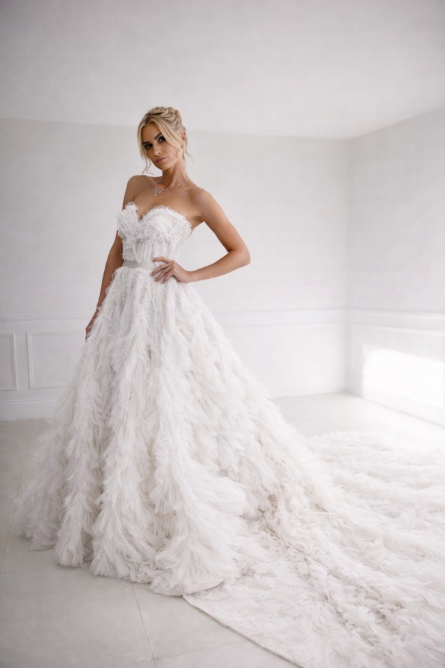 This exquisite 2 piece set features a stunning corset, and a detachable ballgown overskirt. With gorgeous ruffles and sequins adorning each piece, this gown showcases custom-designed lace by Steven Khalil, making it truly unique. Originally owned by the talented Kailey Kirk, her friend Steven Khalil produced this remarkable gown. If you need an experienced planner or need inspiration, check out her page! Kailey Kirk weddings . The Alterations are made easier due to the versatile 2 piece design. The gown has been professionally dry-cleaned and comes with a Steven Khalil dust bag and hangers. Please note, the veil is not included. Price is negotiable. Available for international and Australia-wide shipping, or pick up in Sydney can be arranged We have other wedding gowns available for purchase Please see our other listings