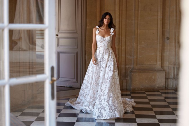 The gown boasts a breathtaking train that enhances its dramatic yet flattering silhouette, perfect for creating unforgettable wedding photos. Whether you’re walking down the aisle or dancing the night away, this dress is designed to make you feel radiant and confident. I confidently performed my first dance in this dress, as it is so comfortable and secure. It also includes a discreet hand-held bustle sewn beneath the train for added convenience.