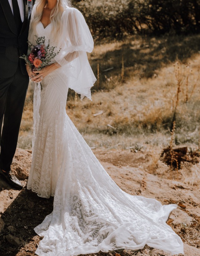 This is truly one of the most stunning gowns out there—and it’s ready to make another bride feel incredible. Featuring the iconic Cade sleeves (yes, those sleeves!), this dress had its moment—literally featured on Rue de Seine’s Instagram. The dramatic sleeves are removable; I wore them for the ceremony and took them off for dinner for a totally new look.
