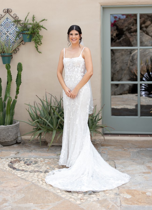 Worn once for about 5 hours -- taken off before the dance floor when I changed into an after party dress. I was told by many it was the prettiest wedding dress they've ever seen. The beading and 3D flowers add a special quality to it without it feeling overdone. Very minor alterations to tailor it to fit my body type -- I have wider hips and a smaller waist! (That's why they ordered a 10, I'm normally an 8)