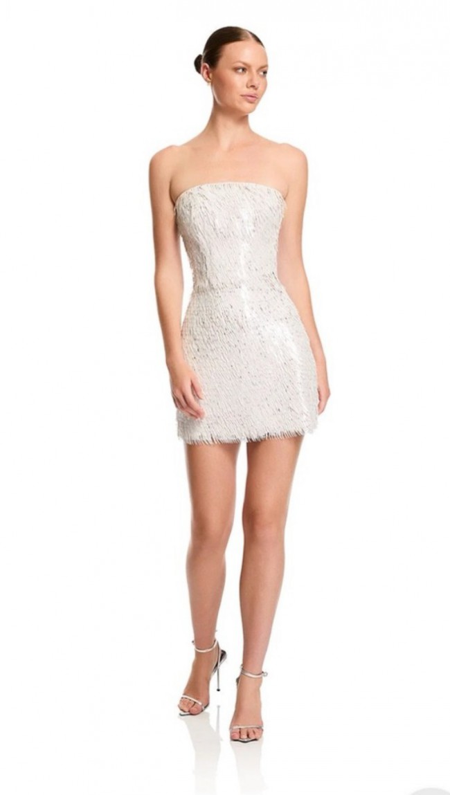 Saturated with textual sequinned fringing, Jones is for the bride who wants to make maximum impact.