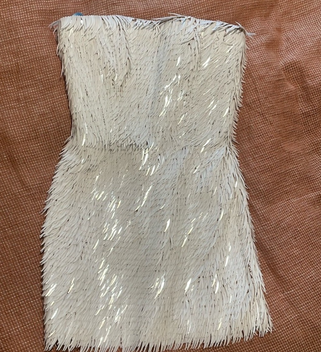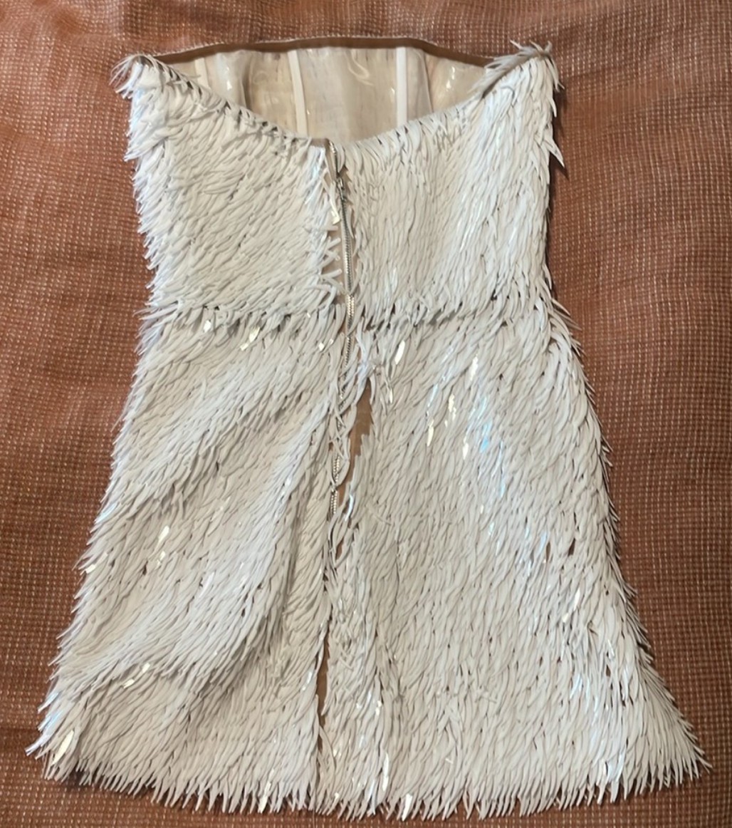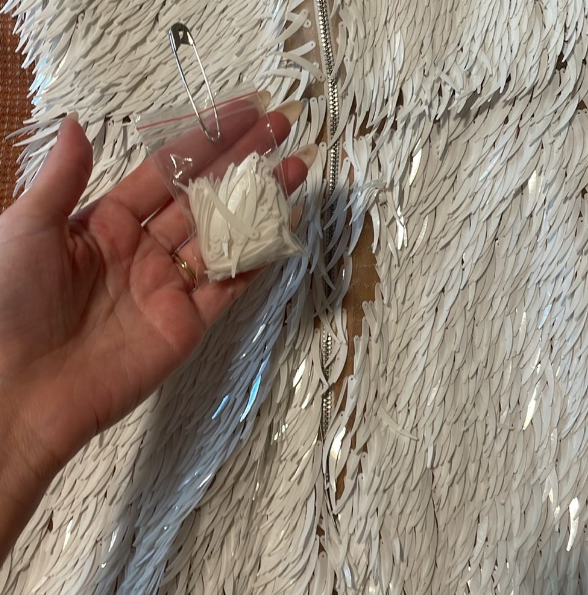 In great condition. I’m a size 2-4 US waist fits tight, bust area is looser. Includes a bag of extra sequins in case you lose any/need to replace if you alter the dress!