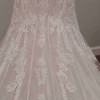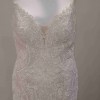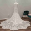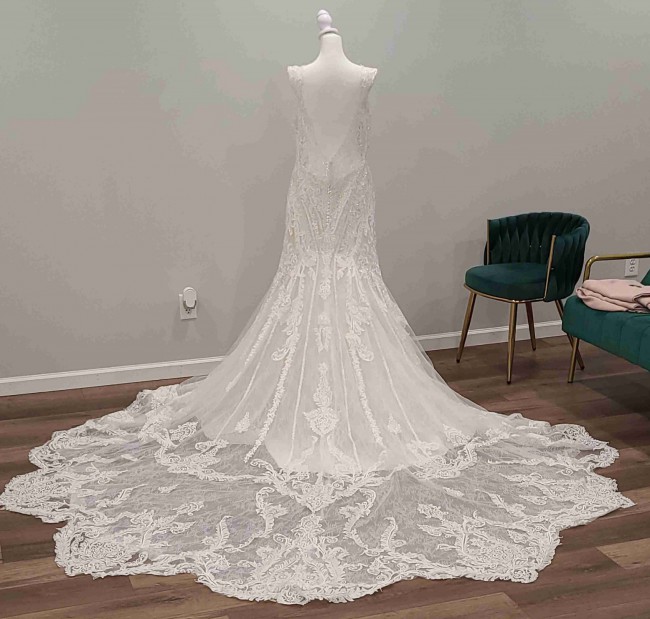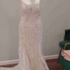 Fit and flare with beautiful sequin and embroidered fish tail train. Sequin spaghetti straps and lace capped sleeves. Colors are ivory with champagne.