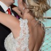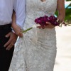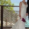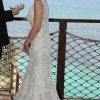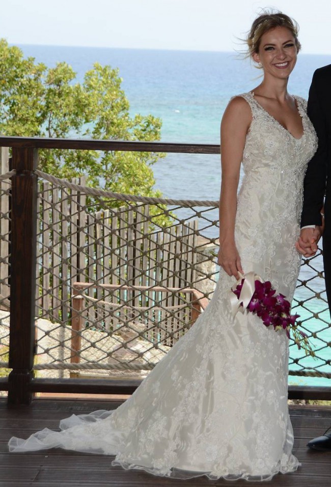 The dress has a V-neckline, no sleeves, and a deep-V back with fabric-covered buttons for an elegant touch. The lace train is absolutely stunning and has an American-style bustle, making it easy to move around after the ceremony. It’s a simple yet breathtaking gown, and I hope it brings someone else as much joy as it brought me on my special day.