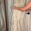 I wore this dress for my elopement, and it was only on for a few hours before I carefully packed it away. It’s a sheath-style gown with the most intricate overlaying lace, featuring 3D flowers, delicate lacy leaves, sequins, beading, and embroidery. The underlayer is a lightweight, incredible soft silk that’s ideal for travel since it doesn’t wrinkle. The ivory silk brightly shines through the pure white lace, creating a beautiful contrast.