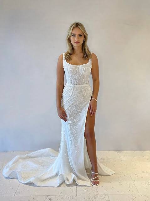 Square neckline/ boned bodice/ beaded fabric/ pearl fabric/ low back/ side leg split