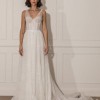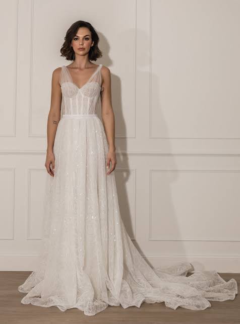 V neckline/ boned bodice/ beaded fabric/ sheer tulle straps