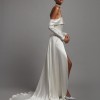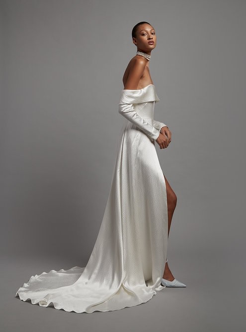 This sleek A-line gown features a bardot neckline, slim sleeve, corset bodice, slit detail and dramatic train. In hammered silk satin.