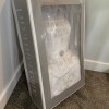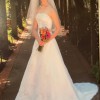 Classic look, strapless, white, beautiful beading with this belt and stunning broach at waistline. Size 4. I was [removed] lbs. when worn. Dress was immediately professionally cleaned and sealed after wedding and the veil was sealed with the dress. I still have all accessories and will send with the dress if purchased (tiara, jewelry).