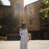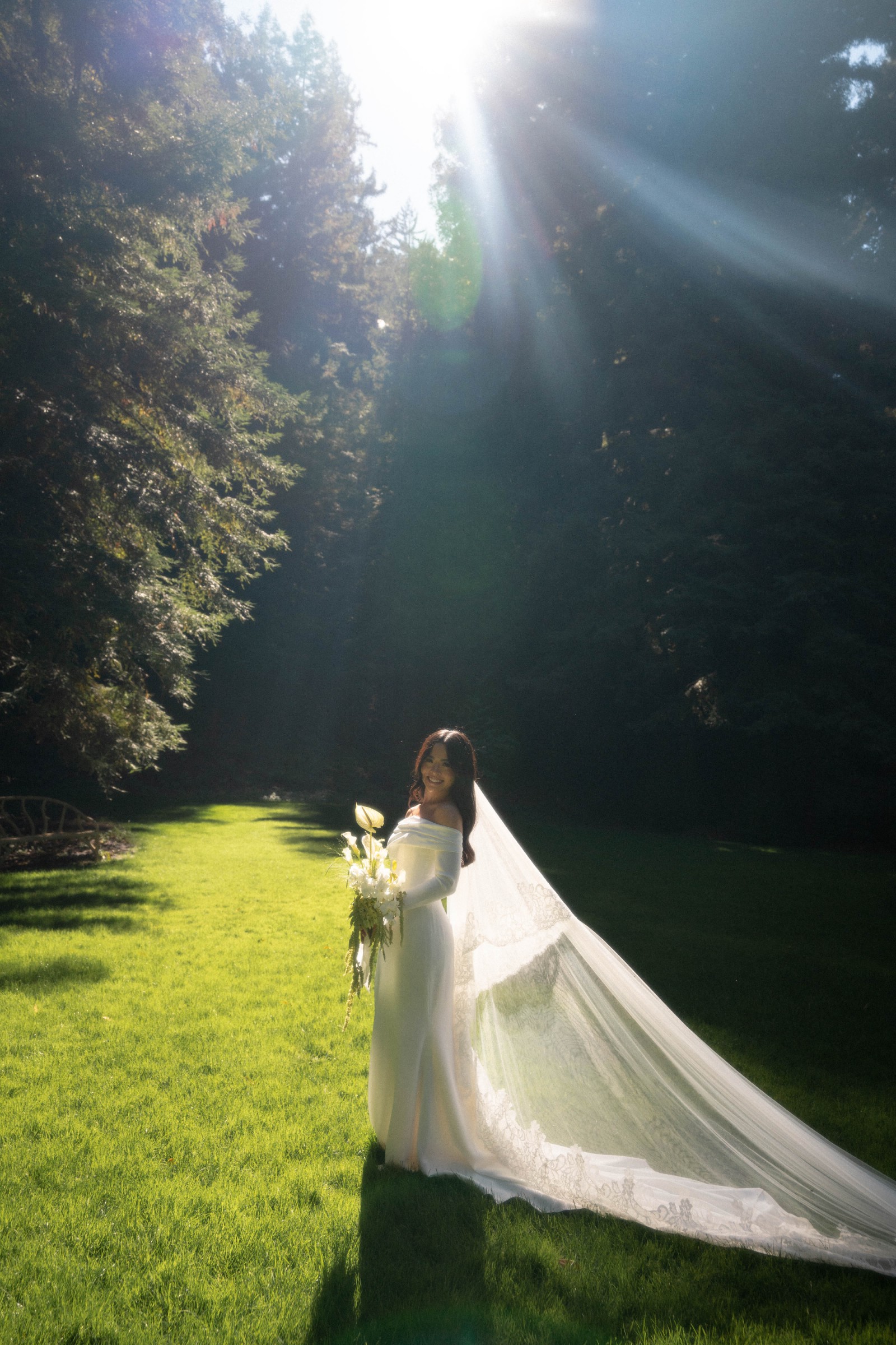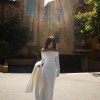 A minimalist sheath crepe gown featuring a corset top, off-the-shoulder long sleeves and slouched neckline.