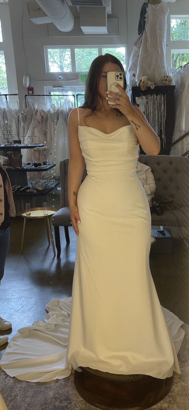 This is a timeless, elegant dress that deserves to shine on someone’s special day! It has a flattering fit, sleek straps, and a stunning train accentuated by the custom button detail. Selling because I’ve decided to go in a different direction with my wedding look.