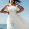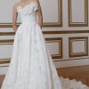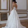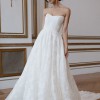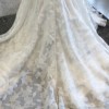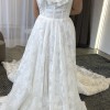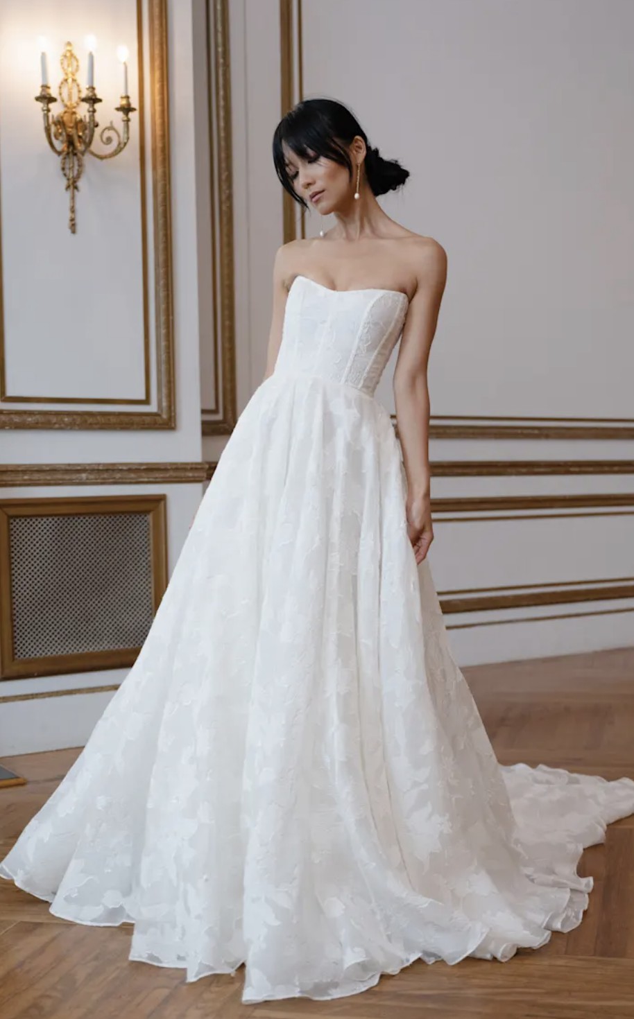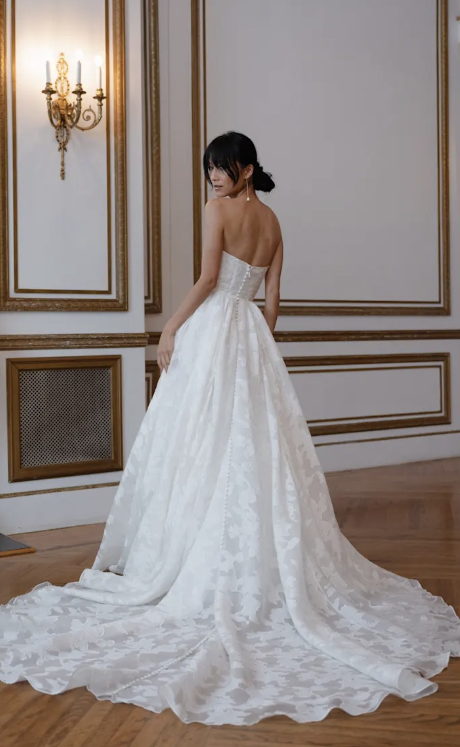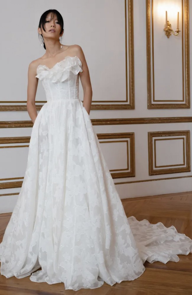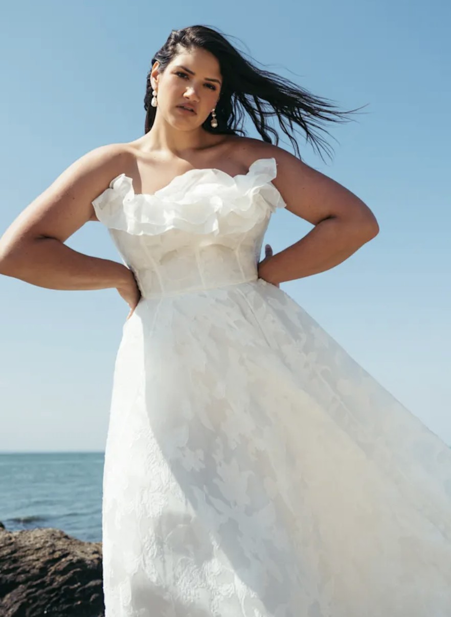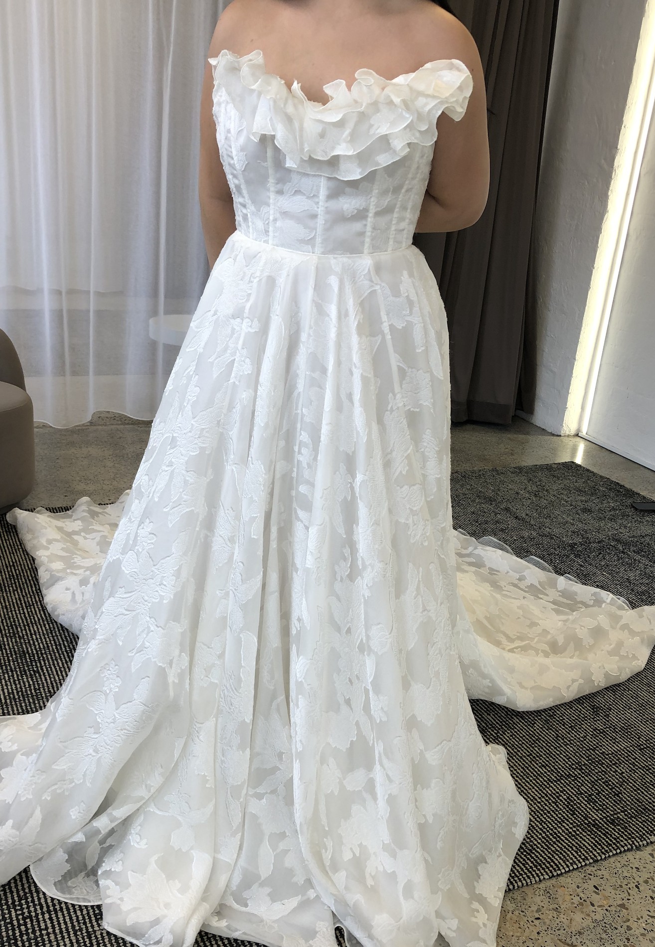 This is a new store sample with tags. The Willa gown, cut in our beautifully lustrous textured Florian burnout jacquard fabric is a true romantic. Featuring an endlessly flattering corset bodice with exposed boning detail, and a dramatically organic ruffle at the sultry scoop neckline. The light as air fabric moves beautifully in the full ball skirt, and covered buttons to the hem finish the gown with a classic bridal detail.