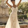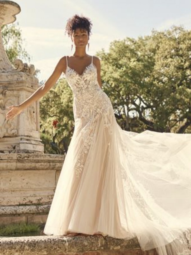 Enchanting in its illusion lace bodice, embellished with intricate lace motifs over delicate tulle and Chantilly lace. The deep V-neckline and scoop back create an alluring illusion, complete with beaded spaghetti straps for a touch of glamour. Indulge in elegance and sophistication with The 'Rabia' Gown by Maggie Sottero.