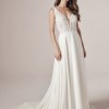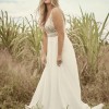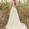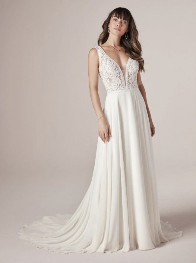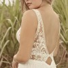 Communicate your romantic side with ease in this simple, yet elegant V-neck chiffon bridal gown. The lace bodice, illusion details, and jersey lining offer an effortless and timeless charm that will make a statement on your special day. Made with Aurora chiffon and featuring two sequin lace bands and intricately placed lace motifs, this gown will make you feel luxurious and exclusive. The plunging illusion V-neckline and lace tank straps add to the overall sophistication of this piece, while the illusion V-back with a keyhole and illusion lace tank straps add an extra touch of glamour. For added comfort, the gown is lined with Virtue stretch jersey and features a zipper closure. Minor neckline alterations can be made using the included additional lace motif. To complete the look, pair with light nude bra cups.
