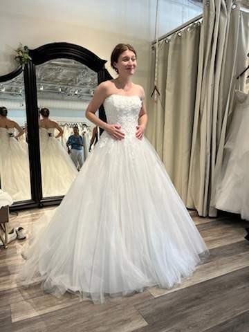 Completing this exquisite look is a matching veil that adds an ethereal touch, ensuring you radiate elegance as you exchange vows. Sized at 8, this dress is not just a piece of clothing; it’s a stunning representation of love, joy, and the beginning of a beautiful journey. Allow this Ella 7974 to be the canvas for your cherished memories, as you create an unforgettable moment in style and grace.