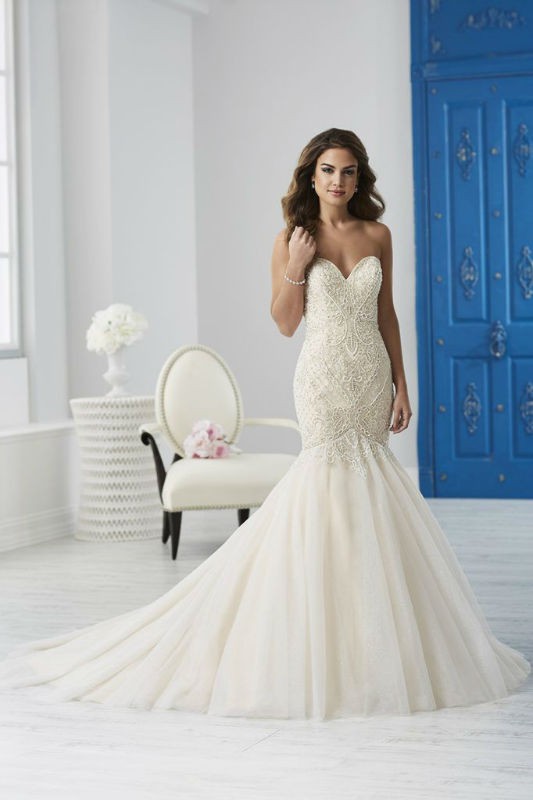 This exquisite House of Wu wedding dress, model 15680, embodies the perfect blend of elegance and romance. The striking trumpet silhouette hugs your curves beautifully, allowing you to move with grace on your special day. Its timeless sweetheart neckline accentuates the décolletage, while the strapless design adds a touch of allure, making you feel like the star of the occasion.