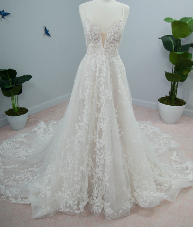 Bridal sizing varies from designer to designer. The measurements listed for each dress are accurate and come directly from the designer. It is important to know your 3 measurements when determining if the dress is the right fit for you.