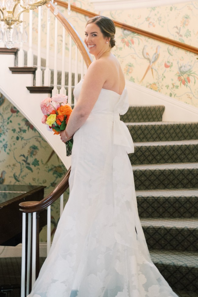 Authentic Nouvelle Amsale dress. The rose floral detailing is gorgeous - gives Carolina Herrera vibes for less. The front is a sweetheart neckline with an illusion plunge cutaway. There is a beautiful bow in the back with buttons running down. Zipper in back but completely hidden. Can wear shapewear underneath if needed. Photographs very well and is comfortable to sit in. Dress has been professionally dry cleaned with no stains, no sign of visible wear.