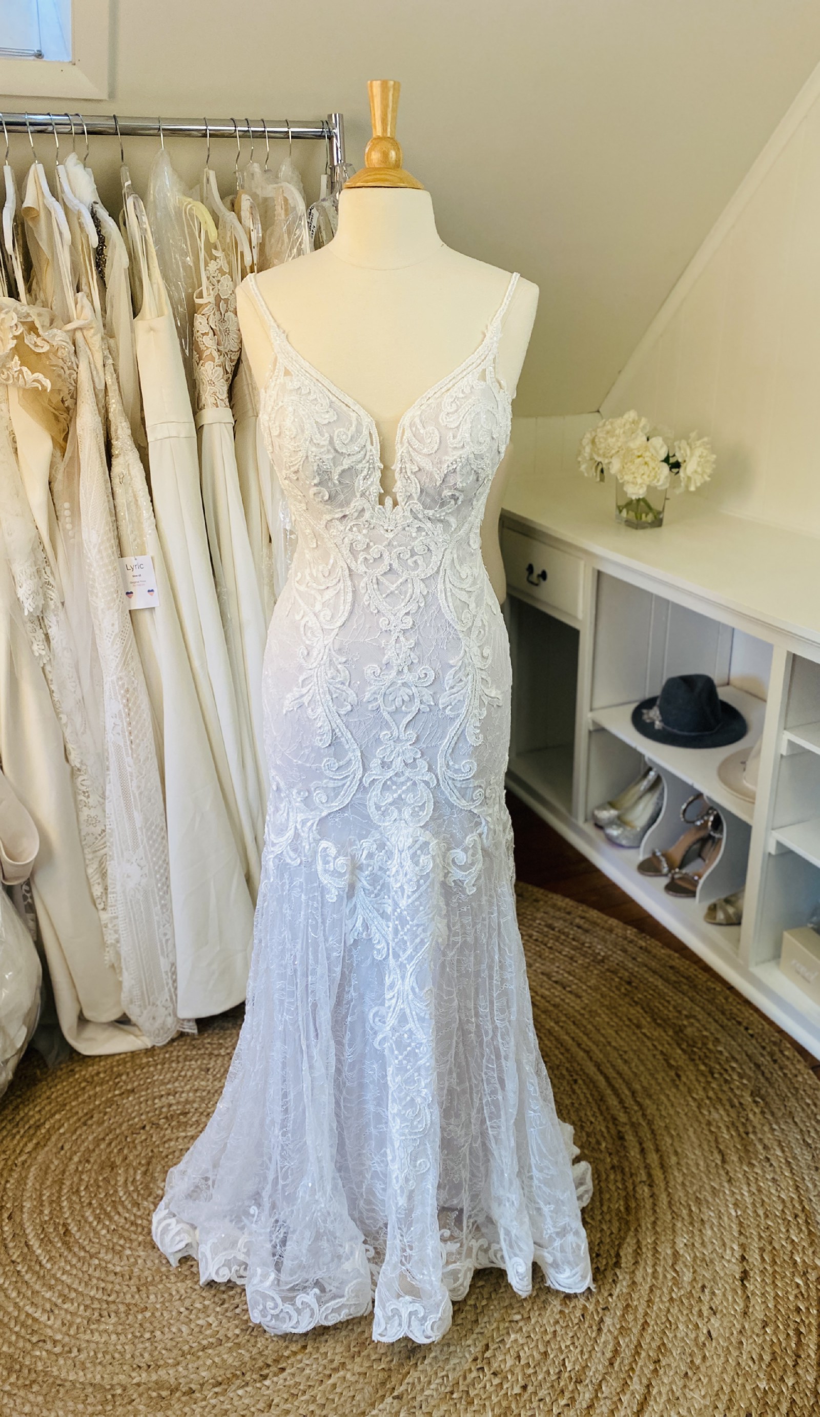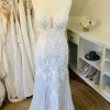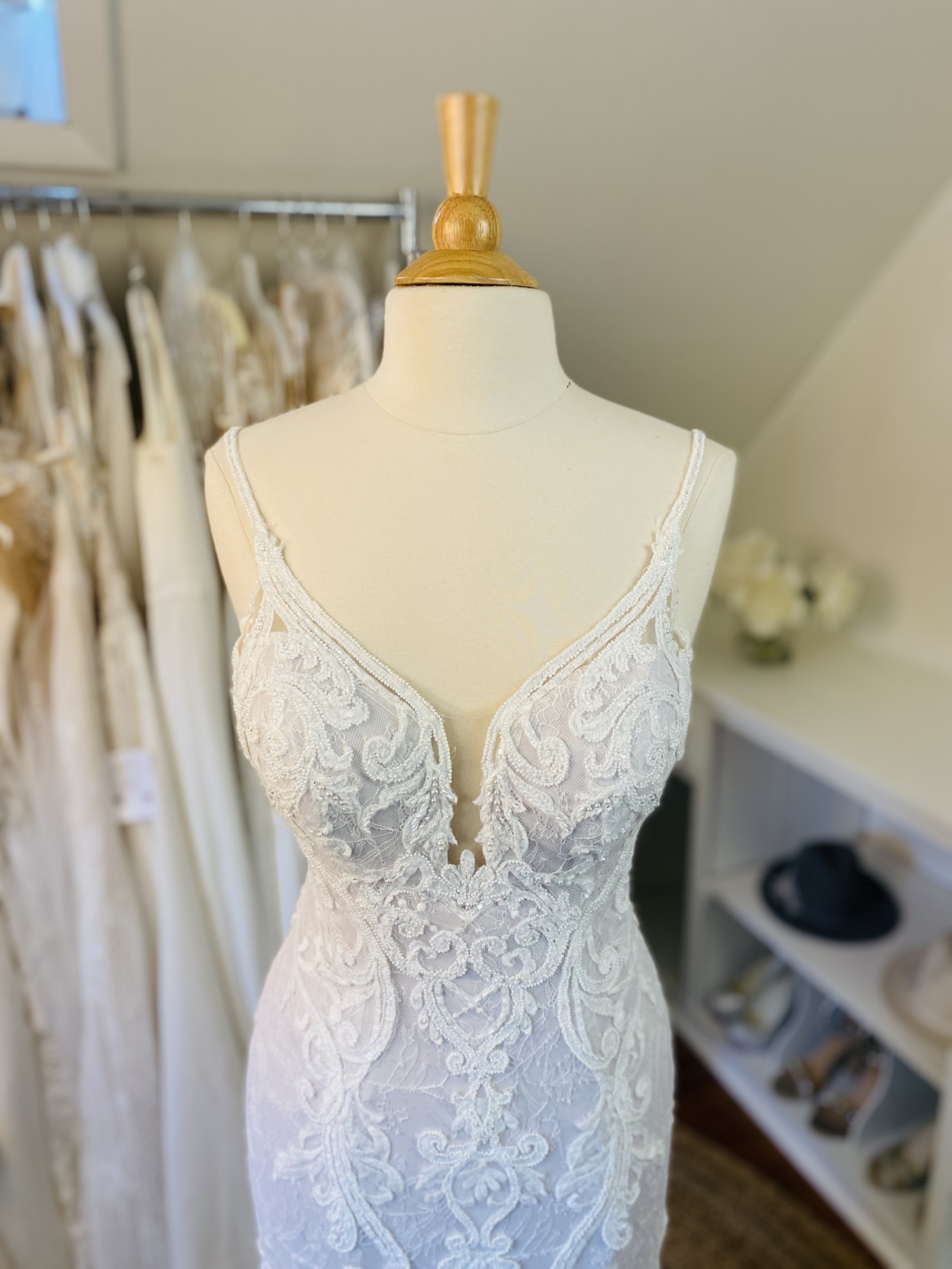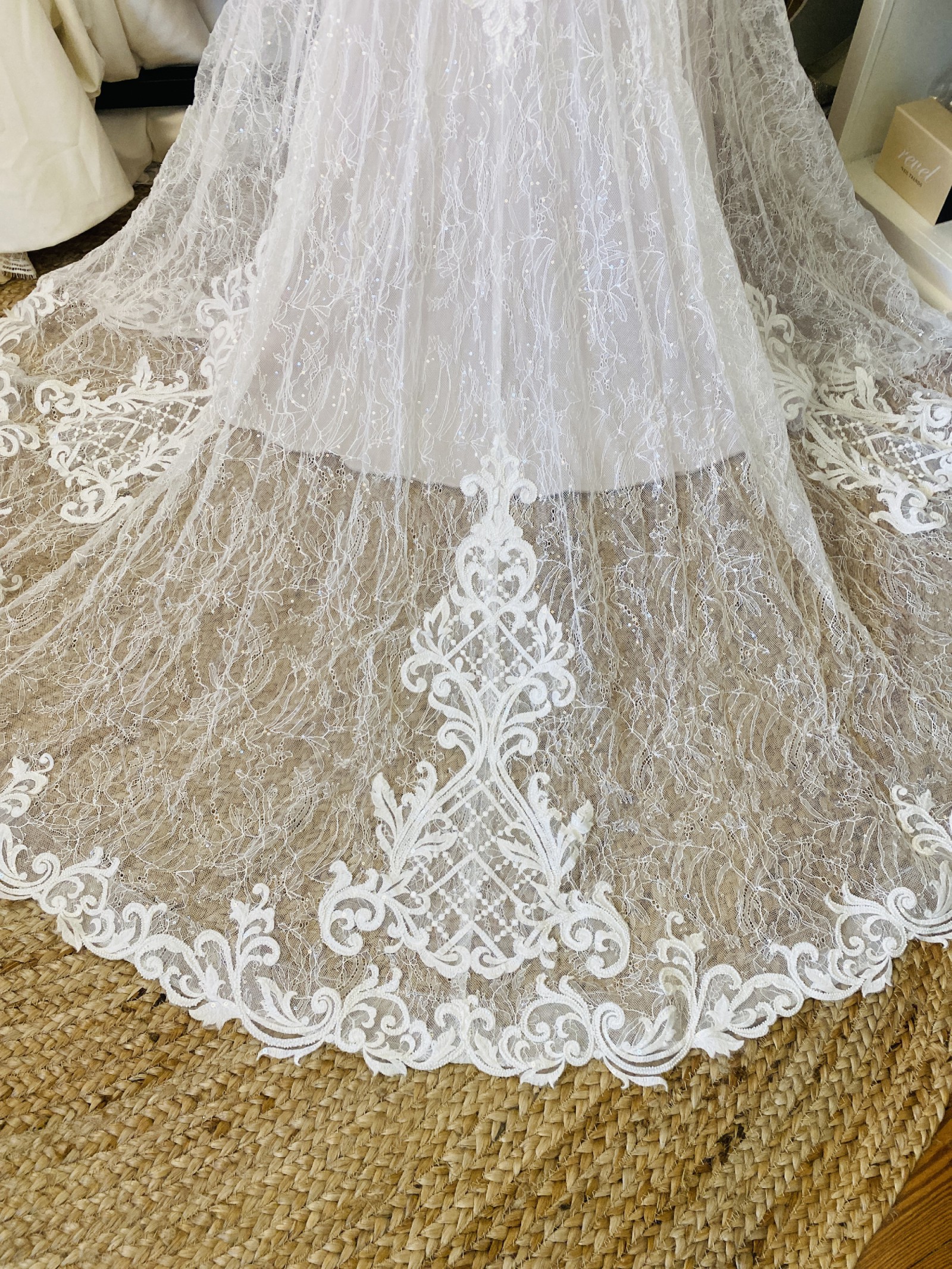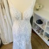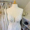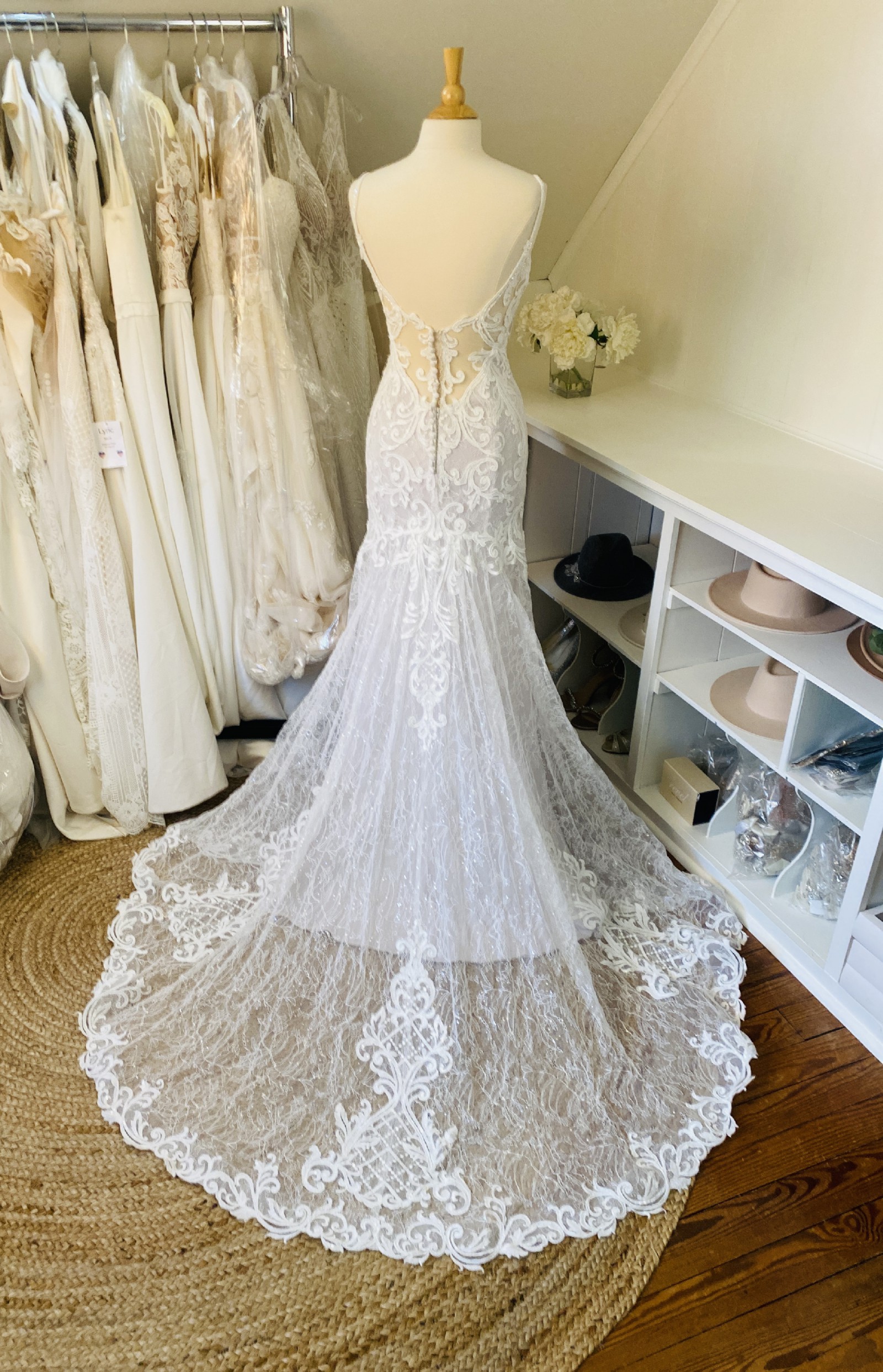 Maggie Sottero Esther is an alluring gown of shimmery textured lace! The deep neckline is mirrored in the low, sheer lace back. A layered train elevates this look completely.